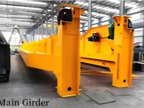 It adopts a solid box-shaped structure with standard camber and a reinforcement plate inside the main girder -